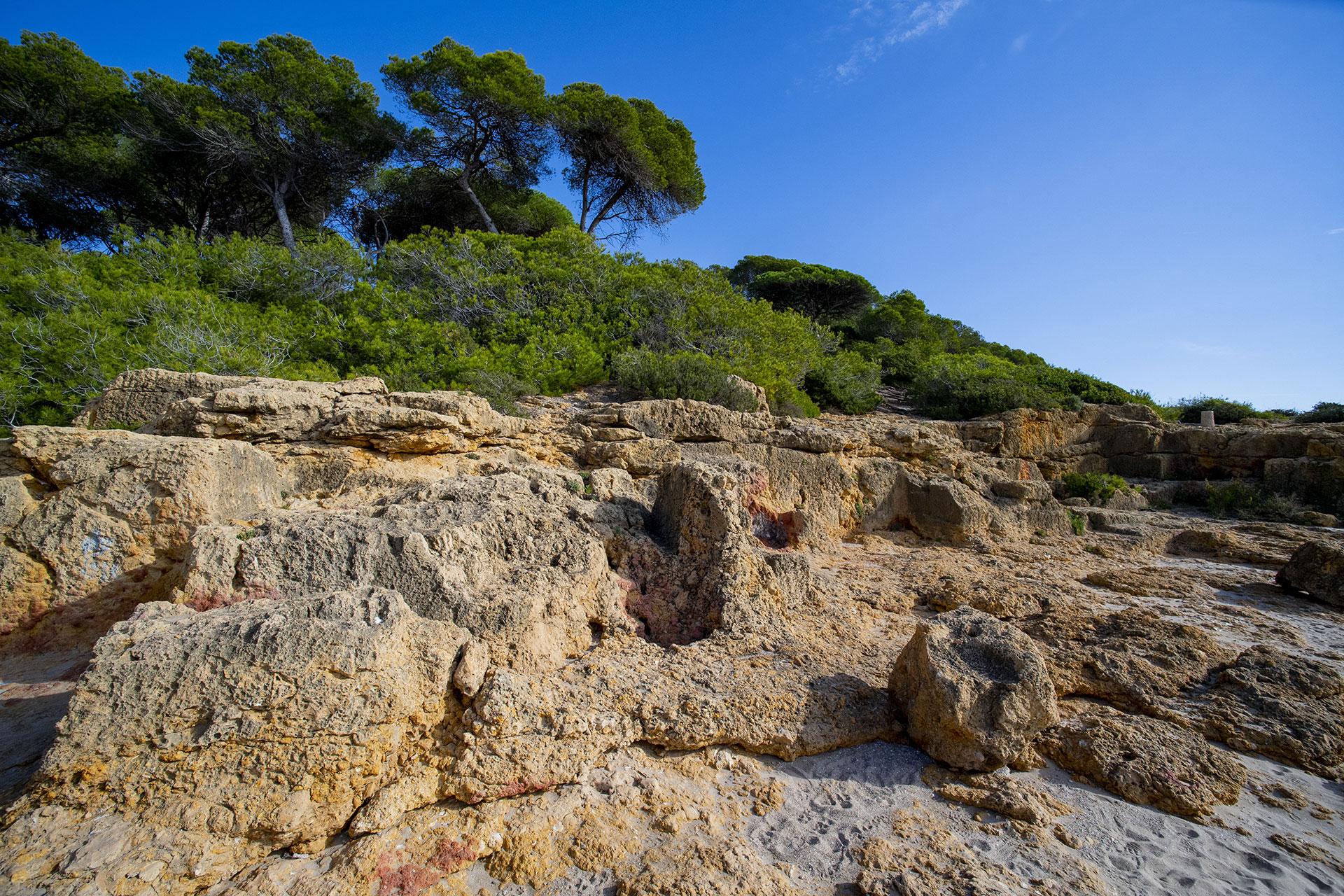 En la Punta de la Creueta, resulta extraordinaria la presencia de una cantera romana bien visible, de donde se extraía piedra miocénica de color dorado, muy parecida a la cercana cantera del Mèdol. Son visibles frentes de extracción, sillares a medio extraer, zanjas de excavación, escombreras, en un conjunto de gran calidad estética en el que, además, son visibles muchos fósiles de invertebrados marinos. Ocupa un área de unos 2000 m2, e incluye una plataforma plana excavada donde posiblemente llegaran gabarras o embarcaciones de transporte del material extraído. En el frente de extracción ubicado en el extremo este de la cantera, se pueden observar hasta tres niveles excavados de sillares.